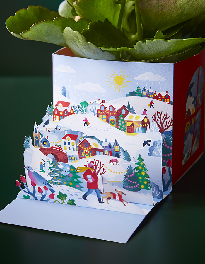 I was approached by Waitrose to create artwork for a pop-up ‘Showstopper’ chocolate box as part of their Christmas 2023 range. They already had the basic concept with the three layers and it was up to me to create a festive, snowy scene with lots of fun detail and cut-out elements. The concept was that one side was a daytime scene, full of joyful, festive activities and the reverse was the night time version with cosy, glowing windows and nocturnal animals.
