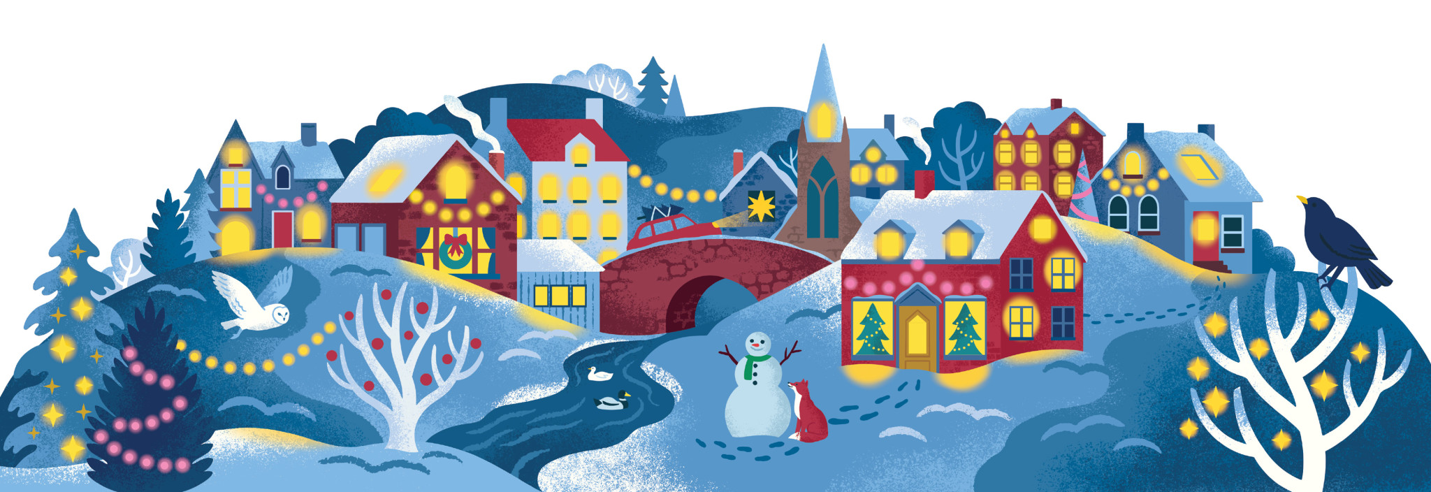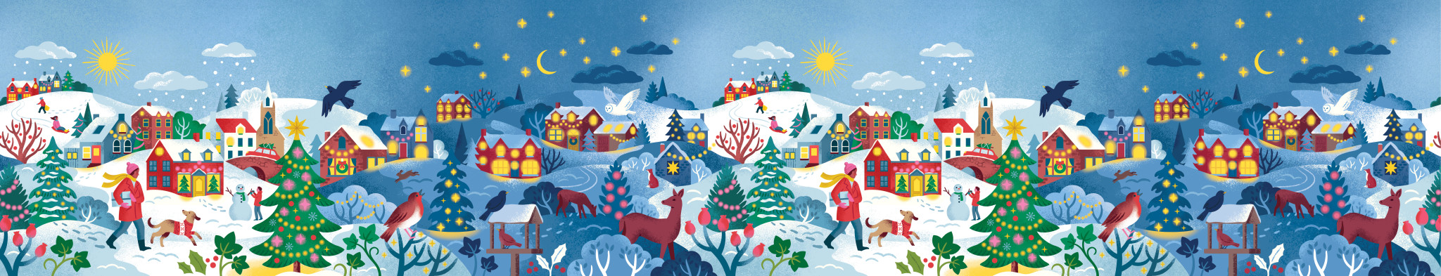 I knew I wanted to bring in lots of nature elements – one of the joys of winter for me is the greenery and wildlife. And the landscapes needed to have interesting silhouettes and twinkly lights. It was definitely one of the more technically challenging things I’ve worked on, especially having the illustration work from both sides. I also enjoyed the challenge of bringing in more detail than I’m used to – my natural inclination is to leave quite a lot of space in my work.