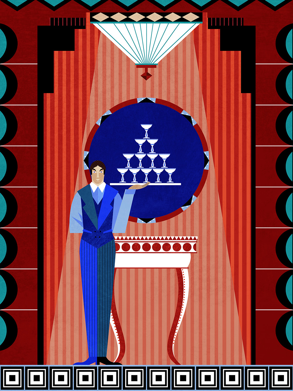“Initially I started the work using a muted palette but the client was keen to something bright and bold. This lead me to the oranges and blues along with a few coffee coloured tones for contrast and I think this worked really well to create a bold statement. The bold colours of the work contrast with the elegant monochrome 1920s décor of the hotel and bring a burst of colour and pattern. The style of the work work is an echo of 1920s style of the Beaumont Hotel – a style I particularly love and often draw inspiration from.”