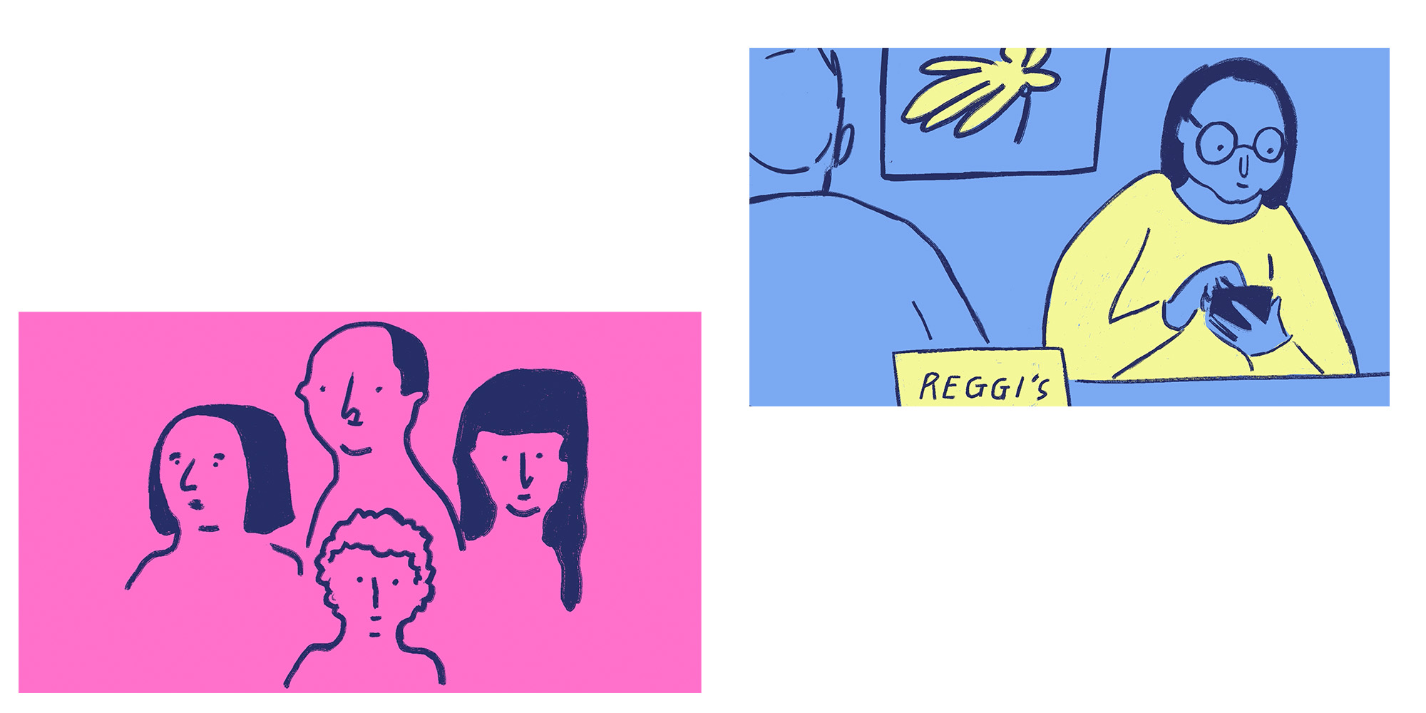 The audio clips are taken from real interviews and if I had more time and in hindsight it would have been great to have met the real podcasters and draw from them ! The brief timing was not so long a turn around and I wasn’t given the opportunity this time. The characters are made up but developed from original references in my sketchbooks of drawing people out and about.