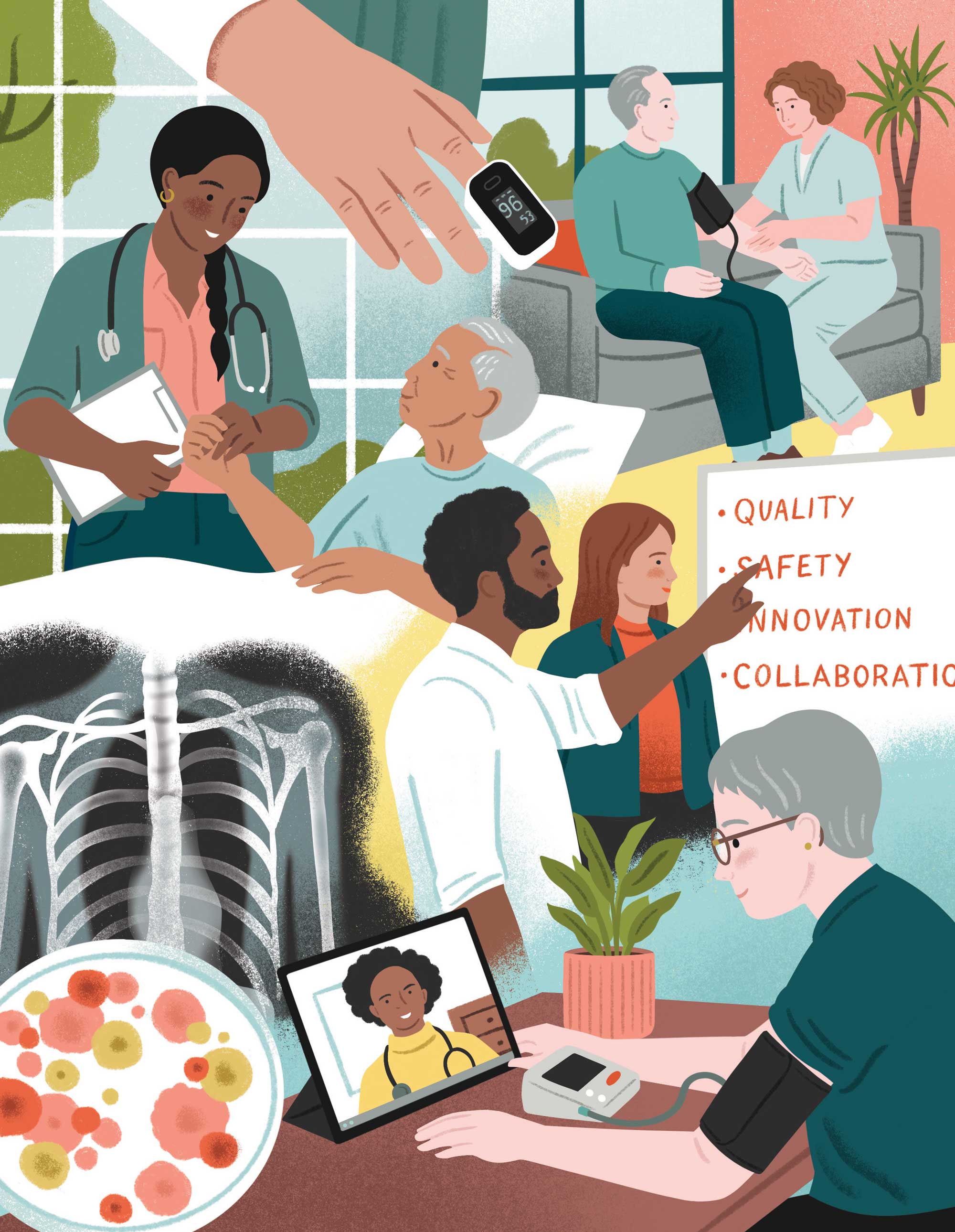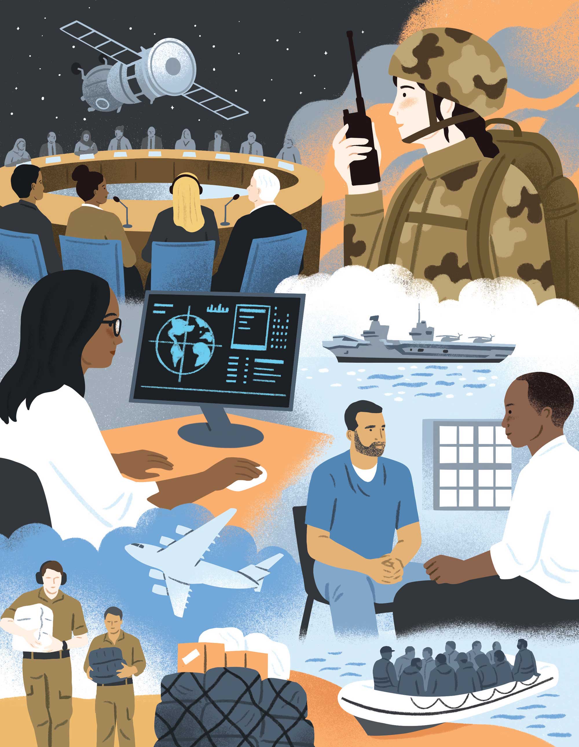 I was asked by RAND Europe to create artwork for their Spotlight annual report. The client wanted montage style illustrations for the four teams featured in the report – Defence, Security and Justice; Science and Emerging Technologies; Education, Employment and Skills; Health and care – as well as nine spot illustrations highlighting some of the research areas.