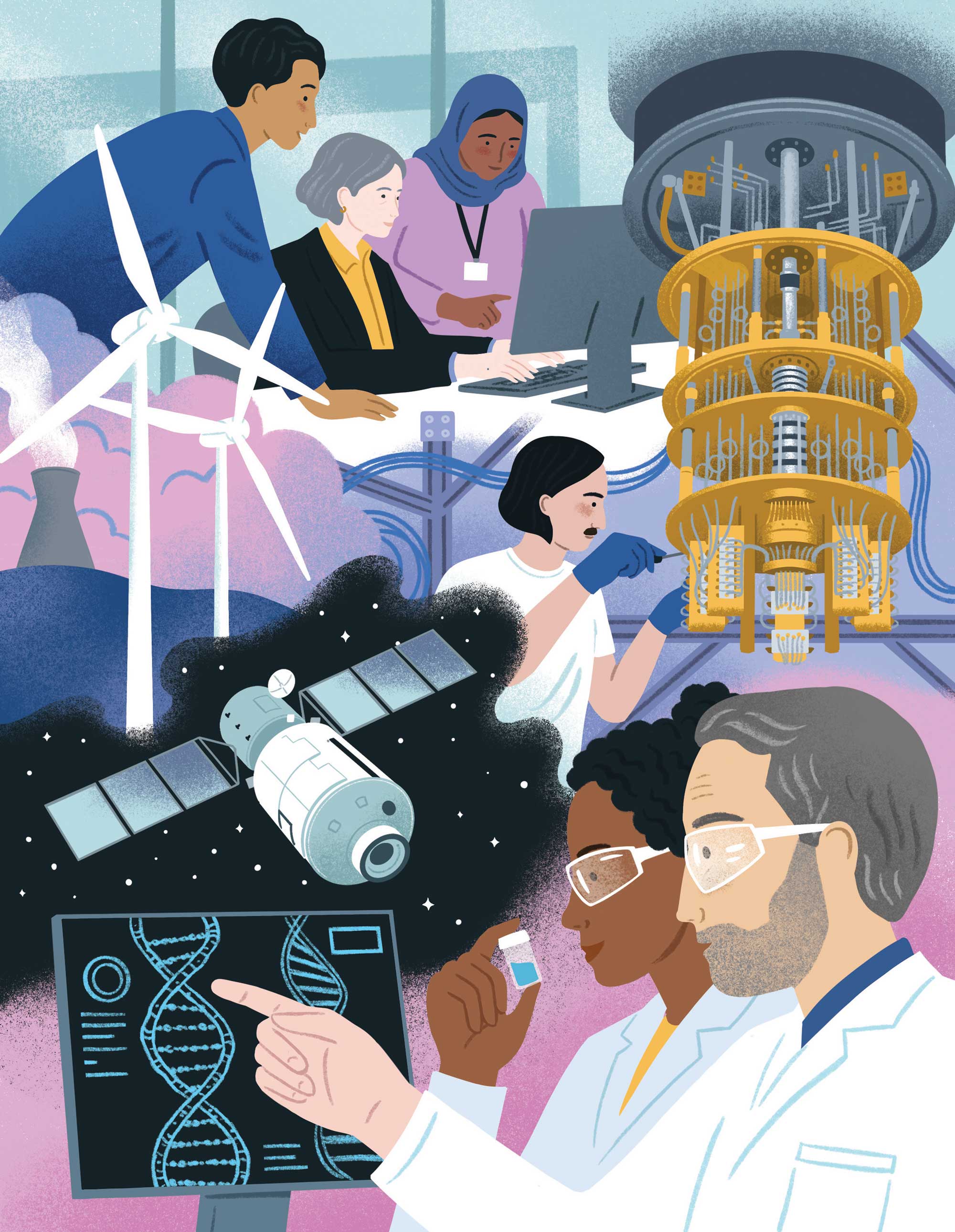It was a new approach for me to work in a montage style and I enjoyed the challenge of fitting the vignettes together without using hard lines to separate them. I wanted the scenes to flow into one another whilst maintaining balance as a full page illustration.It was also my first time drawing a quantum computer – I’d only learnt of their existence a few days before the brief for that one!