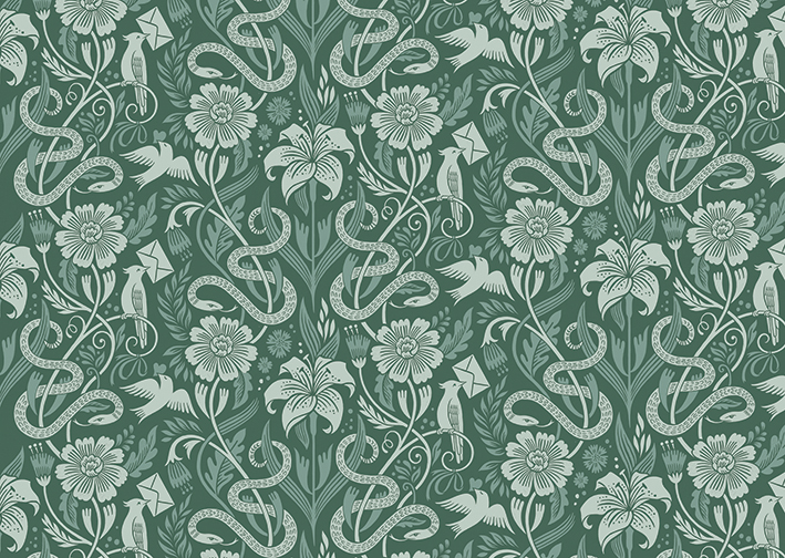 ‘I was given the lovely open brief to come up with a series style for the 3 covers and ornate slipcase as well as intricate patterned end papers and border illustrations for the back and interior pages. I chose a bright palette for this series – including the bright red slipcase – just in time for Valentine’s Day!’