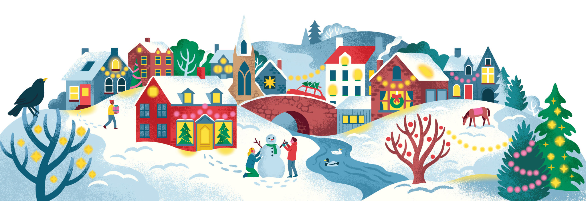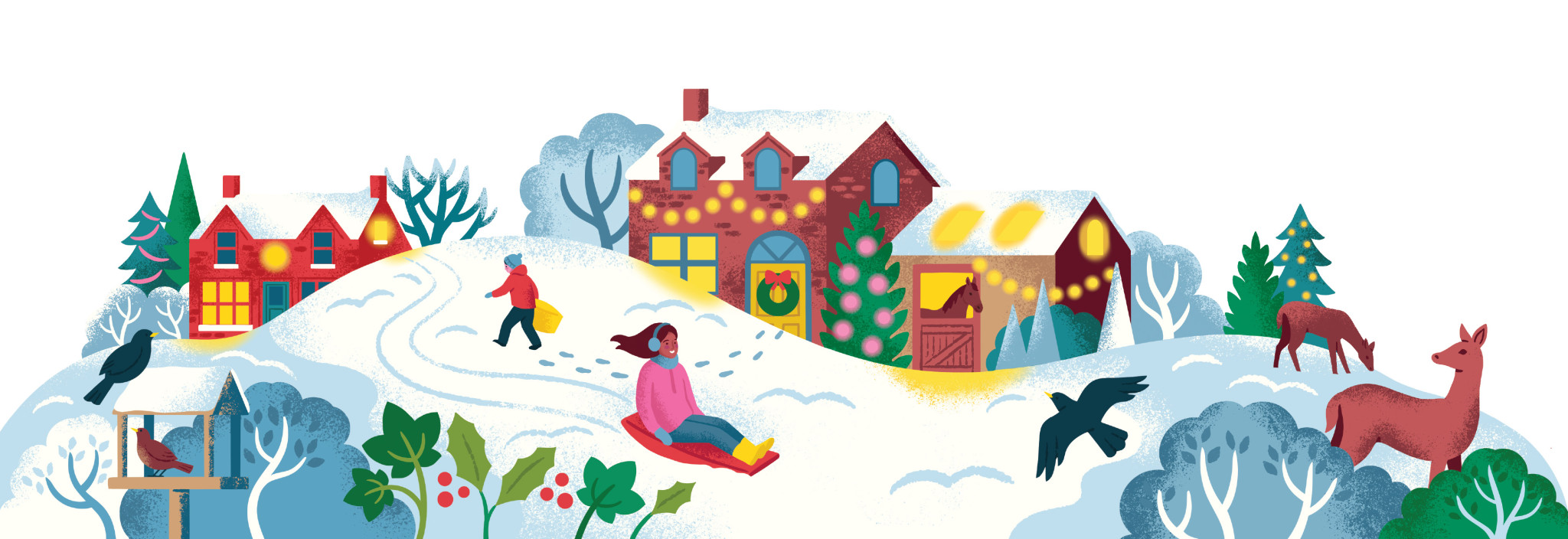 Waitrose commissioned Lucy Davey to illustrate their 2023 Christmas gift collection. With an unique combination of blue and red, the landscapes Lucy has created feel homely with a sprinkle of childhood Christmas magic we’re all looking for. The work has been used across the range, including a 3D illuminating Winter Village Chocolate Box and a musical cookie tin.