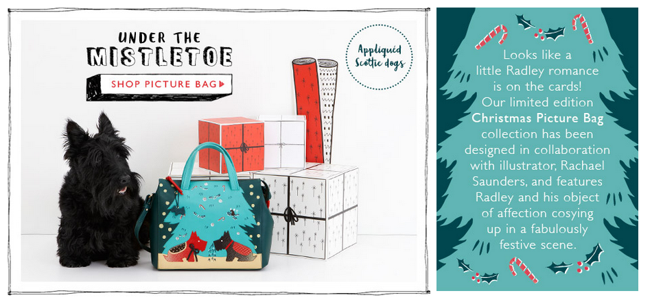Radley is proud to support emerging British talent and has recently collaborated with our very own Rachael Saunders. After having approached Rachael at her graduate show last year, she has worked with Radley to create a beautiful design for Radley’s limited edition Christmas Picture Bag, clutch and matinee. Her festive illustrations feature Radley dog cosying up with a friend under the Christmas tree.